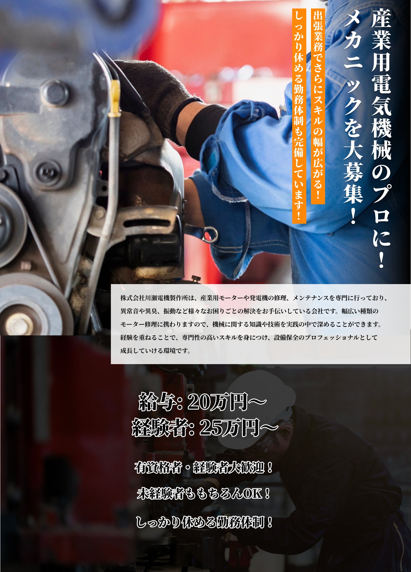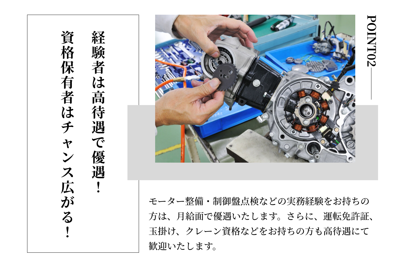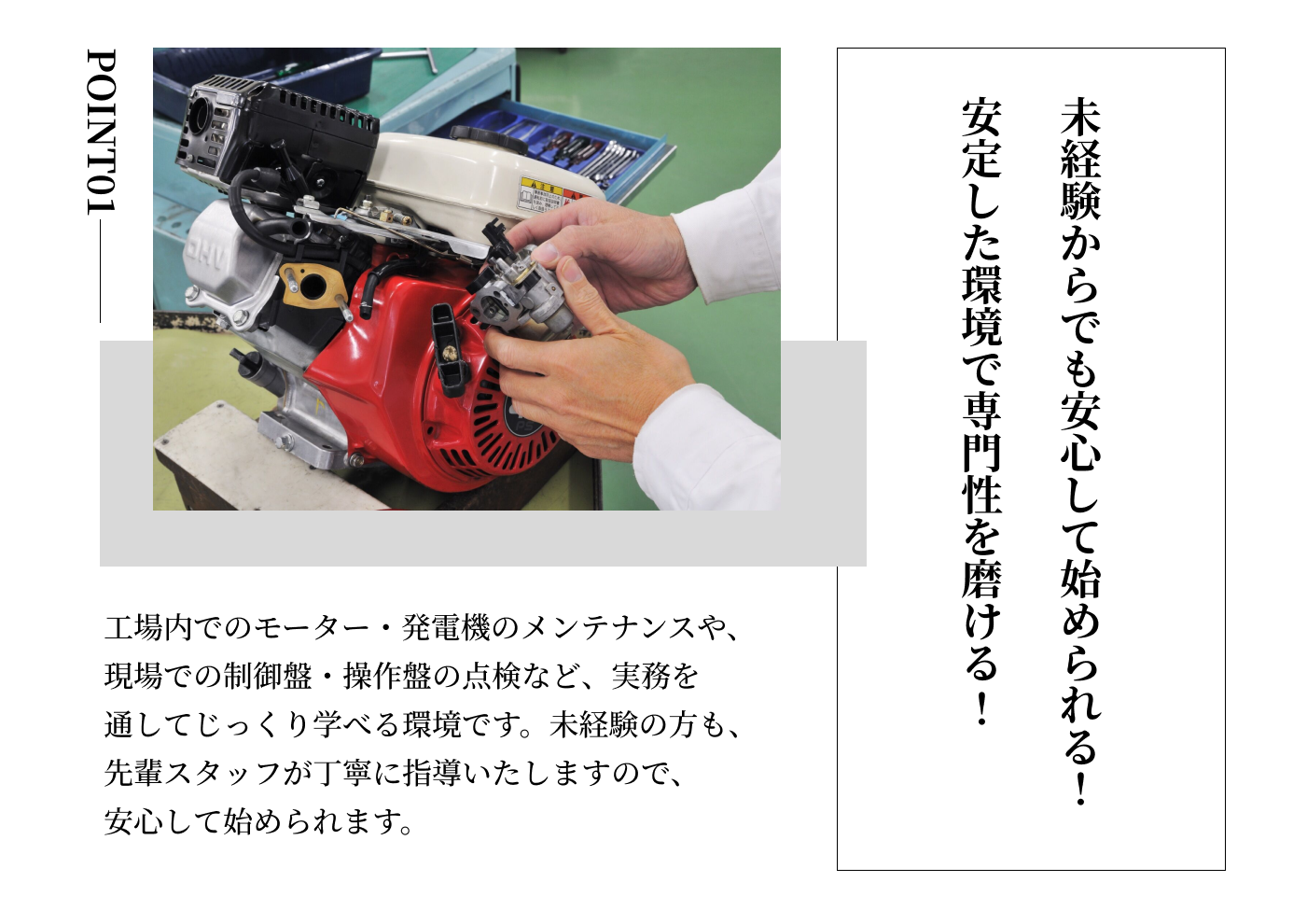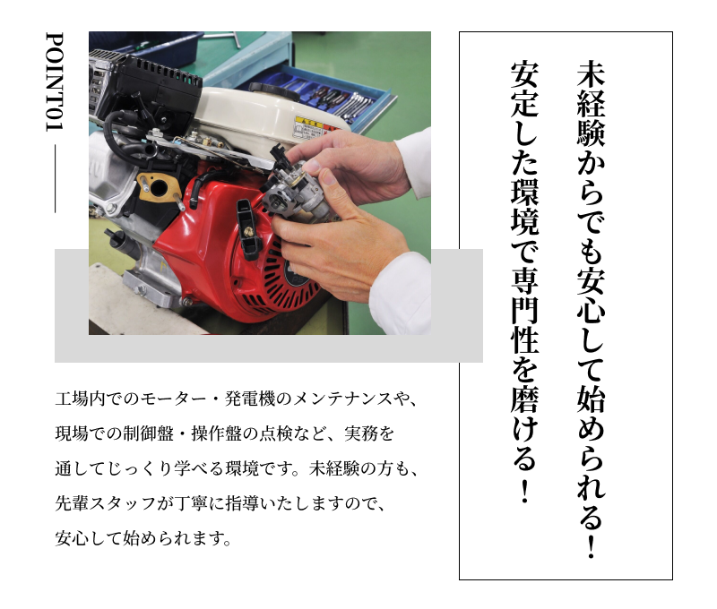 機械いじりが好きな方や、専門知識を身につけて長く働きたい方に向いています。安定した環境でスキルアップしたい方も歓迎です。