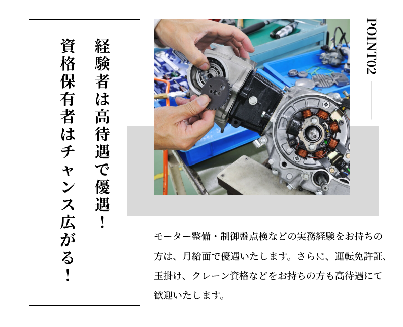| 資格・優遇 | 運転免許証、玉掛けの資格、クレーンの資格をお持ちの方は優遇いたします。 |